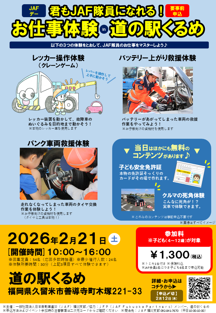 JAFデー 君もJAF隊員になれる!お仕事体験 in 道の駅くるめ(福岡県久留米市:2月21日開催)福岡県